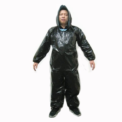 2.外层塑料薄膜属不透气材质,穿着此雨衣运动后会大量排汗,从而通过排汗达到排水,排油,排毒的功效。