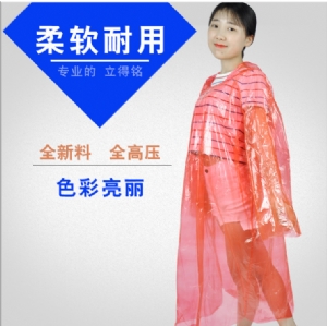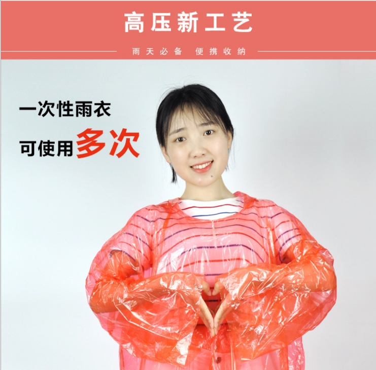 全新料制作,不掉色,无毒无异味,用料厚实,耐穿不易破,一般可用2至5次,小心使用可使用8次以上,有效防雨牢固耐用。该产品具有防雨性能好,颜色多种,无毒、无味,是一款便携的一次性雨衣。选用优质的可降解材料,真正有利于环保。重量轻携带方便,是户外及旅行出行的好伙伴,也是每个家庭所必备的实用品。 户外必备、携带方便、环保无毒 。